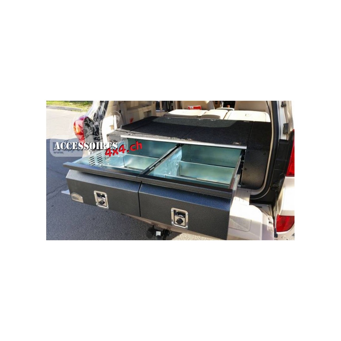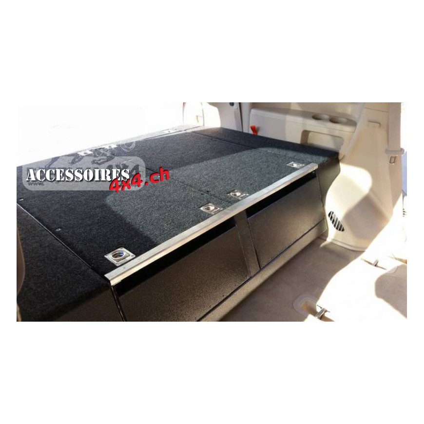 La prima costruzione in acciaio, prodotta in serie con una tecnologia autoassemblante, di altissima qualità e con il desiderio di integrarsi all'interno della vettura. La struttura portante della cassa, così come i cassetti, sono realizzati in lamiera d'acciaio zincata che offre un'ottima protezione contro la corrosione. Il meccanismo di apertura del cassetto è costituito da una sezione in acciaio inossidabile e da una serie di cuscinetti montati sia sul fondo che sulla parte superiore delle guide e sui lati del cassetto. Questa costruzione delle guide elimina qualsiasi gioco tra il cassetto e la struttura di supporto, il che garantisce che la carrozzeria non emetta rumori sgradevoli durante la guida sul campo e garantisce un'elevata affidabilità. Ogni cassetto è dotato di due divisori che possono essere rimossi secondo necessità. Le facciate sono dipinte con polvere d'argento antico, che conferisce tutta la loro estetica. Entrambi i cassetti sono dotati di robuste serrature in acciaio inossidabile che possono essere bloccate. La parte superiore è realizzata in multistrato ricoperto di feltro, fissato ai bordi con un angolo in alluminio, che consente al tutto di fondersi perfettamente nella cabina di guida dell'auto ed è piacevole da usare. Il corpo è dotato di otto maniglie per gli armadietti, che consentono la protezione da oggetti scivolosi come un frigorifero o una cassa posizionati sulla sua superficie. Ai lati del pannello con cassetti e dietro il divano posteriore, ci sono ulteriori vani portaoggetti, che consentono il massimo utilizzo dello spazio per i bagagli e una migliore organizzazione degli oggetti che portiamo in viaggio.