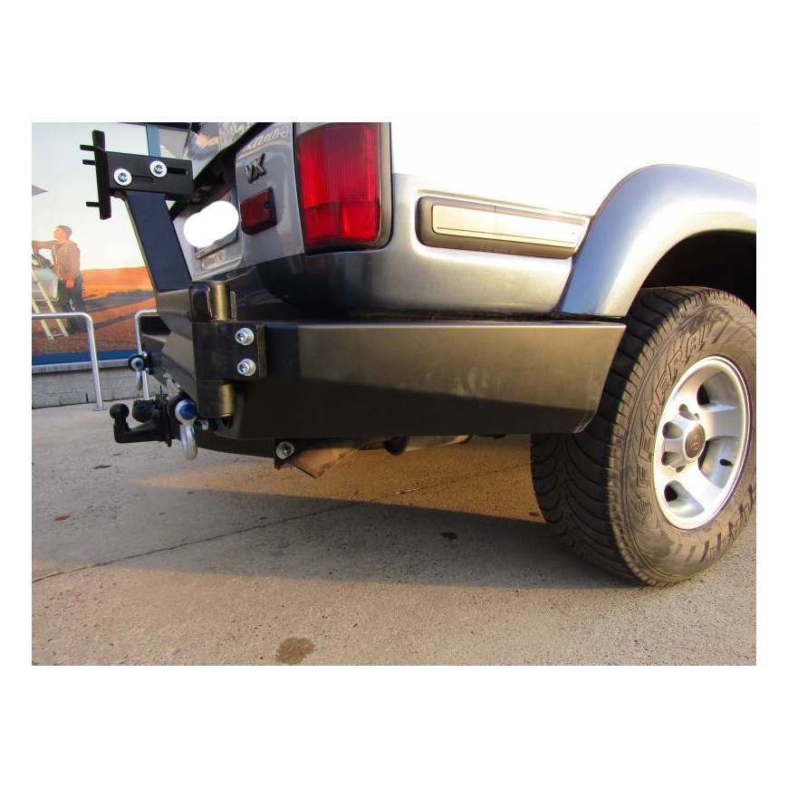 Supporto ruota di scorta per TOYOTA LAND CRUISER J80 89-98 dedicato al paraurti F4x4. La struttura di montaggio è realizzata in lamiera di spessore 4 mm. Il prodotto viene prima tagliato con il laser, quindi piegato su una pressa piegatrice e la forma corretta si ottiene con la finitura manuale. La fase successiva è la protezione anticorrosiva costituita da zincatura e verniciatura a polvere che conferisce l'aspetto finale al fissaggio. Il montaggio della ruota è assistito da una molla a gas, che facilita la chiusura e l'apertura su terreni irregolari. Il fissaggio è molto utile se l'auto ha ruote di grande diametro, perché allevia le cerniere del portellone. Grazie alla solida struttura, il supporto non trasferisce vibrazioni e suoni disordinati al centro dell'auto. L'impugnatura è bloccata con un morsetto metallico che impedisce l'apertura automatica del morsetto.