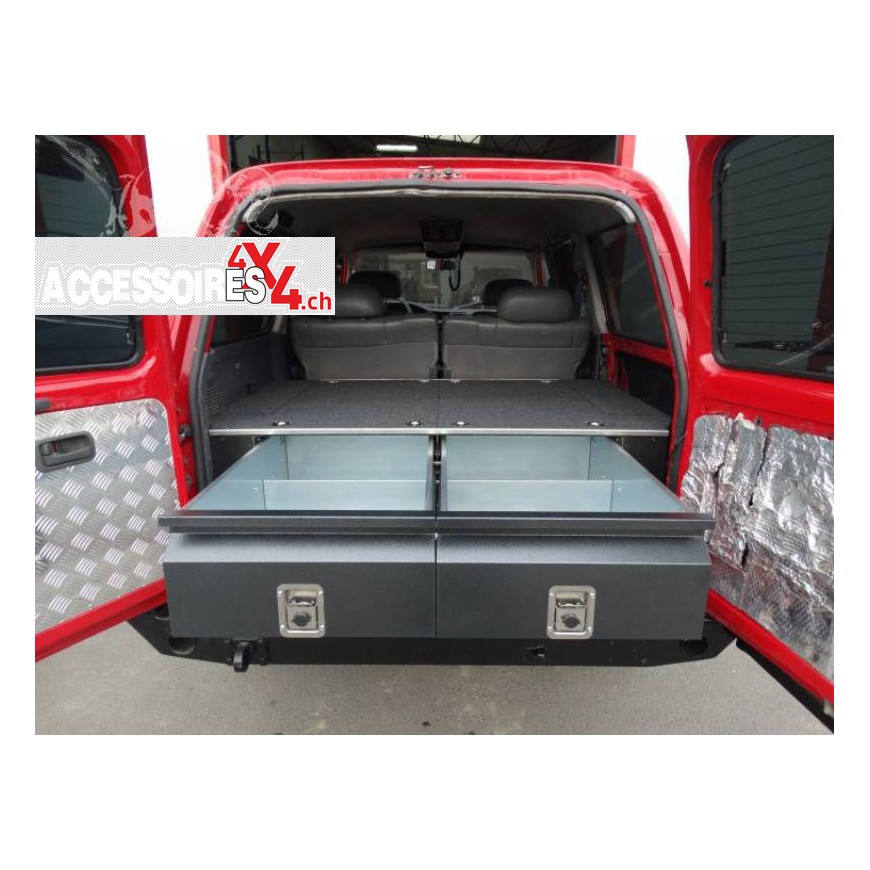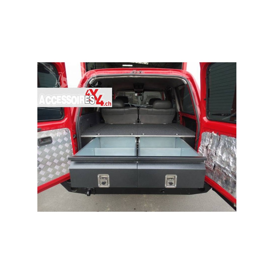 La prima costruzione in acciaio, prodotta in serie con una tecnologia autoassemblante, di altissima qualità e con il desiderio di integrarsi all'interno della vettura. La struttura portante della cassa, così come i cassetti, sono realizzati in lamiera d'acciaio zincata che offre un'ottima protezione contro la corrosione. Il meccanismo di apertura del cassetto è costituito da una sezione in acciaio inossidabile e da una serie di cuscinetti montati sia sul fondo che sulla parte superiore delle guide e sui lati del cassetto. Questa costruzione delle guide elimina qualsiasi gioco tra il cassetto e la struttura di supporto, il che garantisce che la carrozzeria non emetta rumori sgradevoli durante la guida sul campo e garantisce un'elevata affidabilità. Ogni cassetto è dotato di due divisori che possono essere rimossi secondo necessità. Le facciate sono dipinte con polvere d'argento antico, che conferisce tutta la loro estetica. Entrambi i cassetti sono dotati di robuste serrature in acciaio inossidabile che possono essere bloccate. La parte superiore è realizzata in multistrato ricoperto di feltro, fissato ai bordi con un angolo in alluminio, che consente al tutto di fondersi perfettamente nella cabina di guida dell'auto ed è piacevole da usare. Il corpo è dotato di otto maniglie per gli armadietti, che consentono la protezione da oggetti scivolosi come un frigorifero o una cassa posizionati sulla sua superficie. Ai lati del pannello con cassetti e dietro il divano posteriore, ci sono ulteriori vani portaoggetti, che consentono il massimo utilizzo dello spazio per i bagagli e una migliore organizzazione degli oggetti che portiamo in viaggio.
