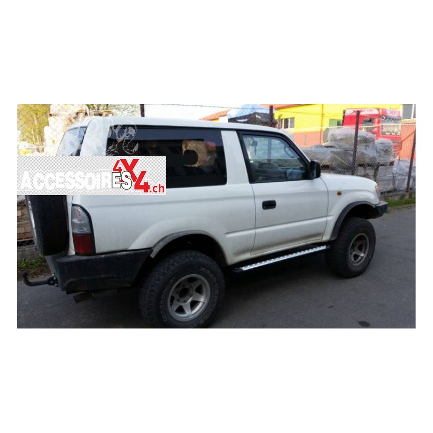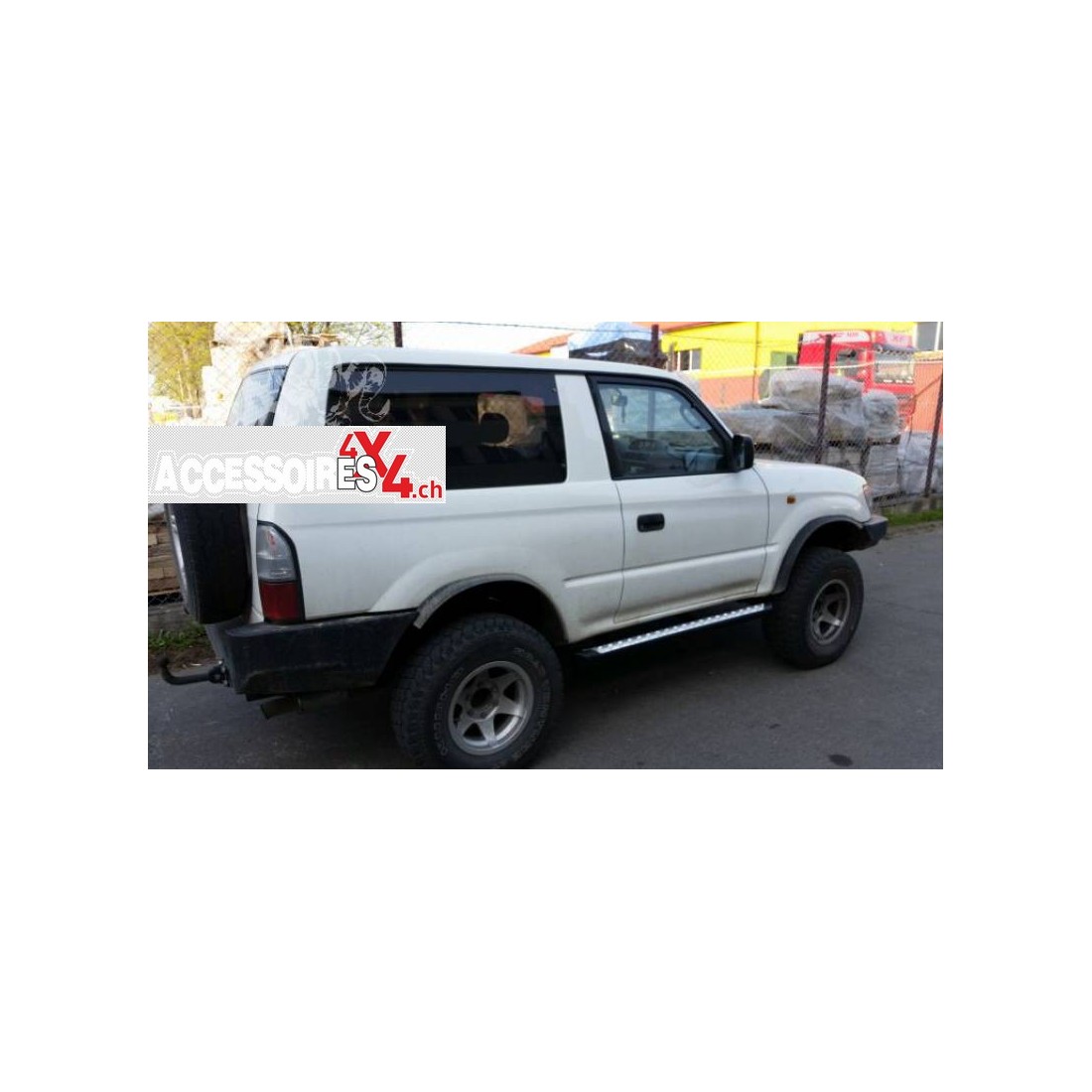 Pedane laterali dedicate a Toyota Land cruiser J90. Gli archi sono costituiti da un tubo Ø 76 mm e un ascensore da 3 mm. Il prodotto viene prima tagliato a laser, quindi piegato su una pressa piegatrice a controllo numerico. La forma corretta si ottiene con la finitura manuale. Dopo la finitura, il passo successivo è la protezione dalla corrosione, che consiste nella zincatura e verniciatura a polvere. Quindi, i passaggi vengono persi in alluminio.