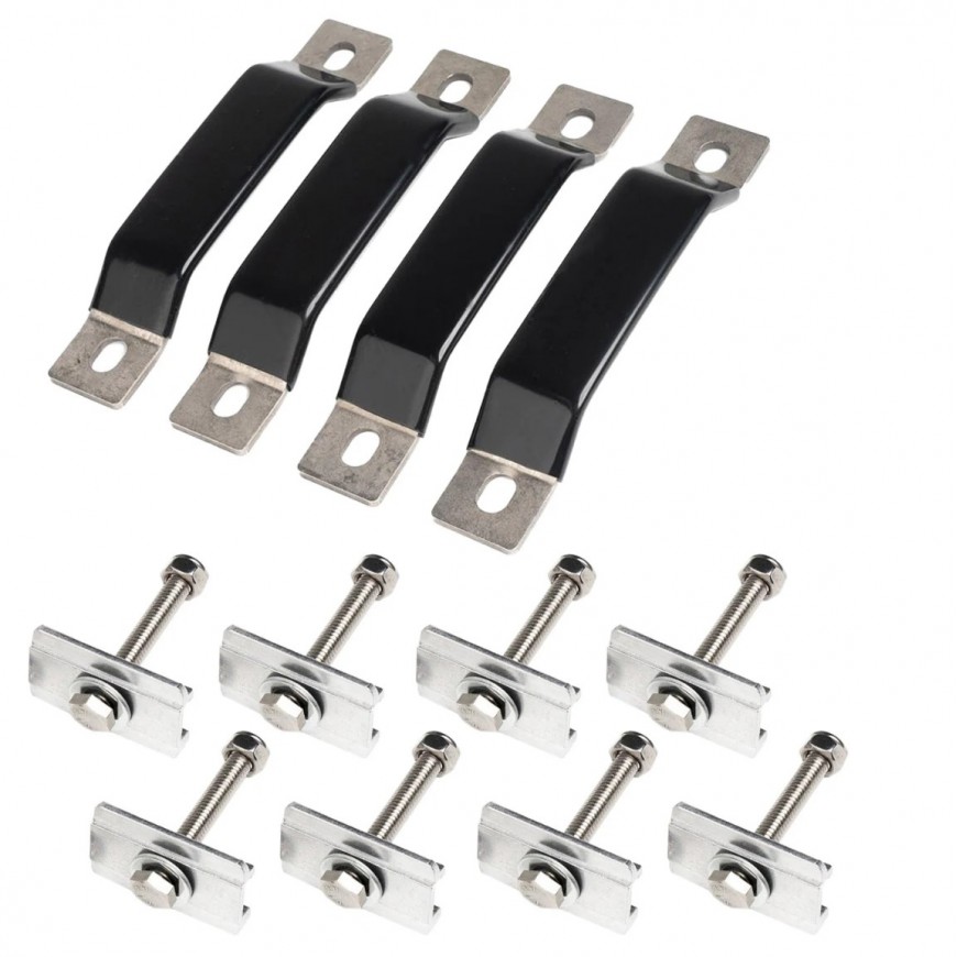 Set di 4 fissaggi + 8 linguette + 8 dadi per fissare la tenda da tetto alle barre portatutto o a qualsiasi altro supporto.