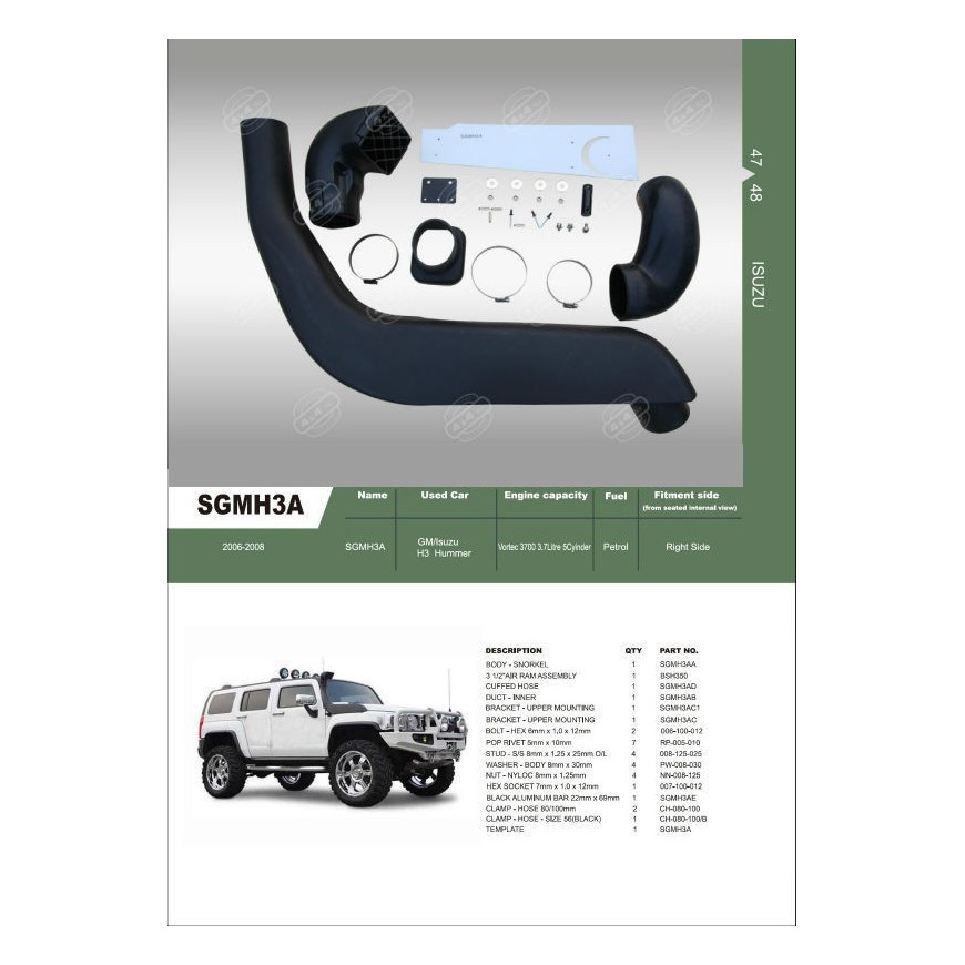 Ogni snorkel viene fornito completo con inserti e bulloneria di qualità, insieme a tutti gli elementi necessari per il collegamento del snorkel alla scatola del filtro aria originale del veicolo.