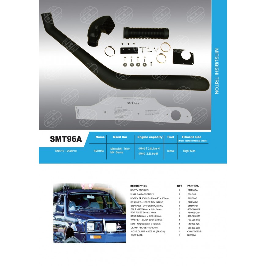 Ogni snorkel viene fornito completo con inserti e viteria di qualità, insieme a tutti gli elementi necessari per il collegamento dello snorkel alla scatola del filtro aria originale del veicolo.