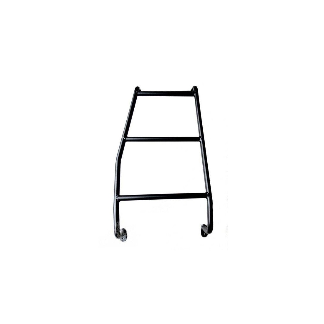La scala è realizzata con tubo Ø 25mm. Il prodotto è interamente realizzato a mano. Una volta finito, è protetto da un primer anticorrosivo. Il prossimo passo è la verniciatura a polvere. La scala vista dall'alto è sostenuta sul bordo della porta posteriore e, dal basso, è montata rigidamente su di essa. Molto utile quando si utilizza un portapacchi.